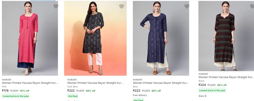Mokshi Women Kurta upto 90% off starting From Rs.178
