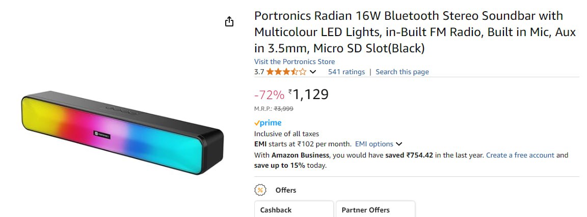 Portronics 16W Bluetooth Stereo Soundbar @ 1129.