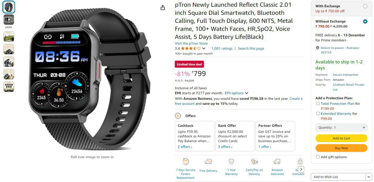 pTron Calling Smartwatch @799 (03-12-24)