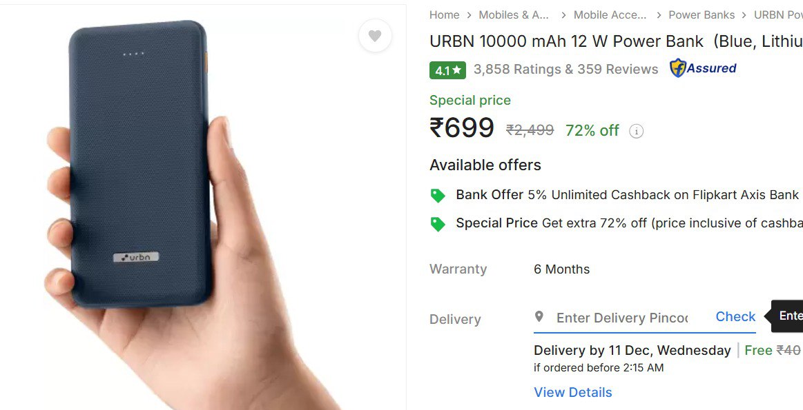 URBN 10000 mAh 12 W Power Bank Rs.699🔥🔥 (04-12-24)