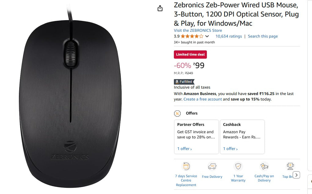 Zebronics Zeb-Power Wired USB Mouse At Rs.99 (27-11-24)